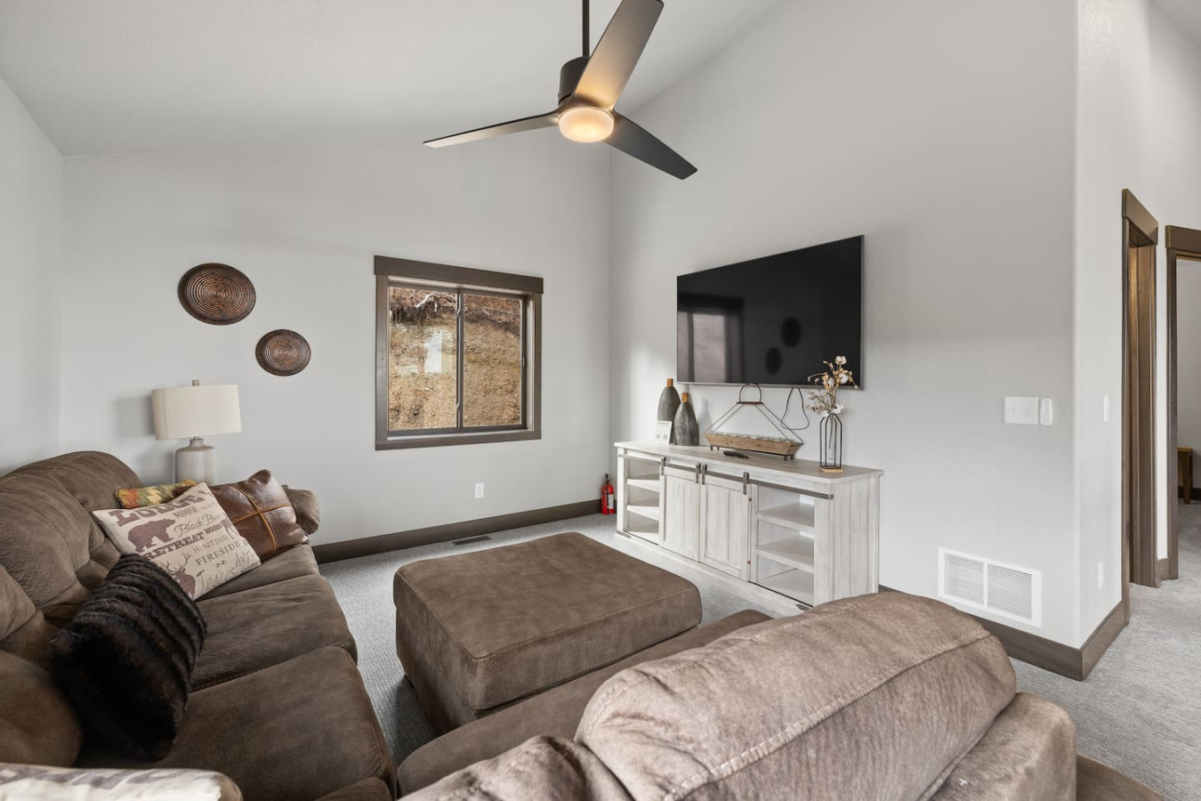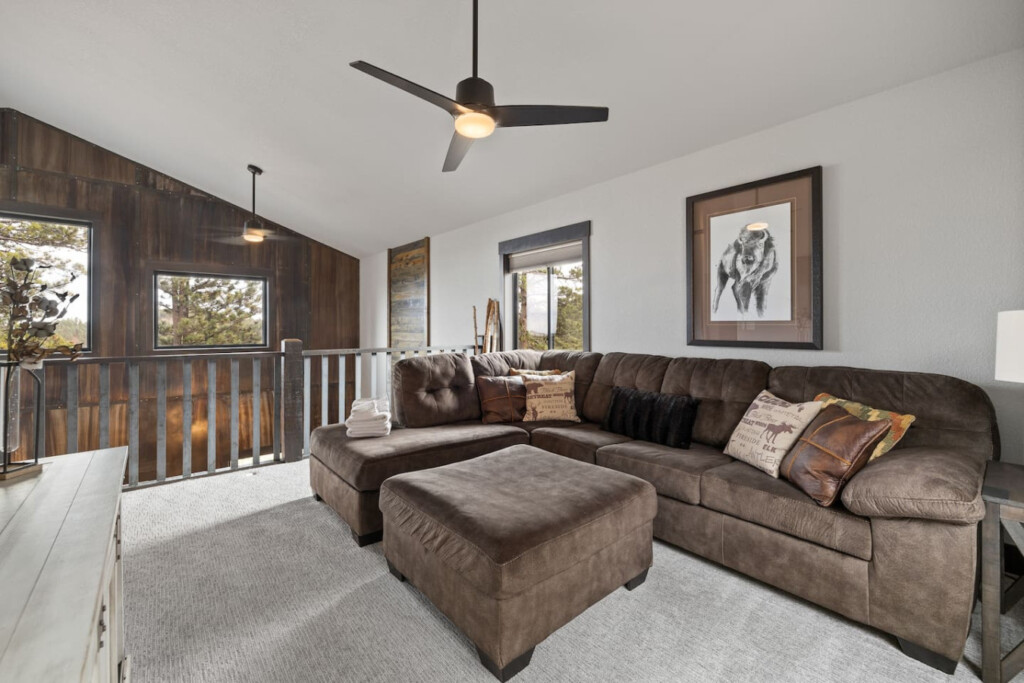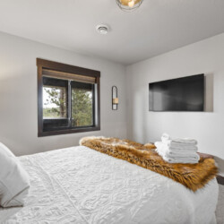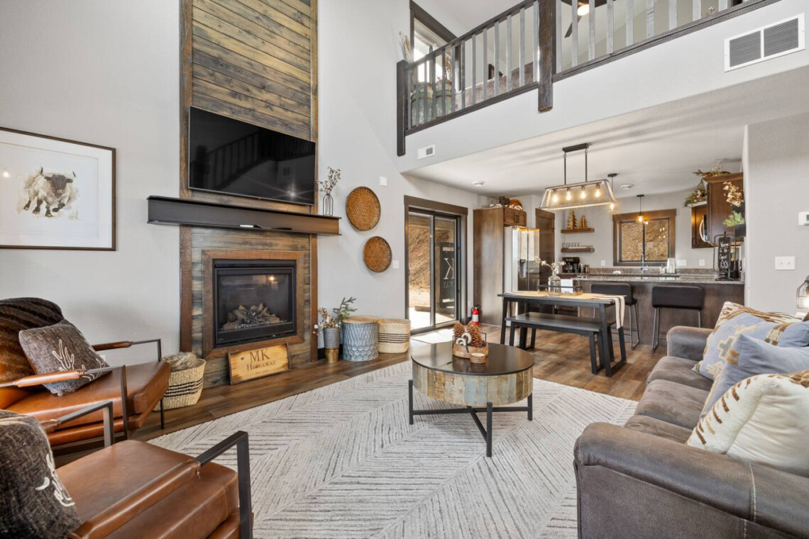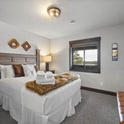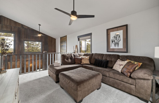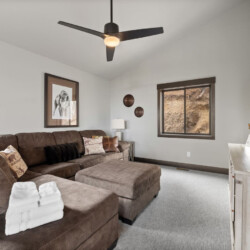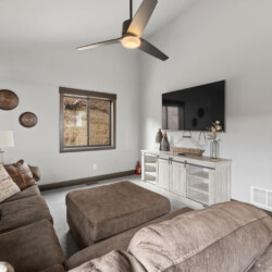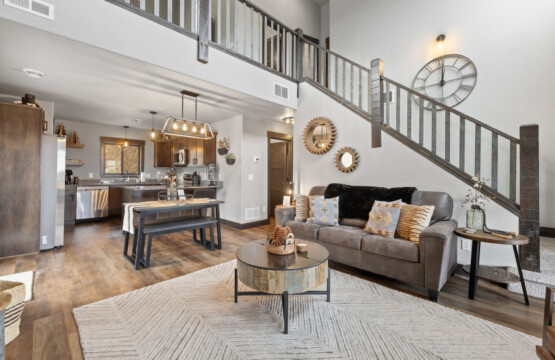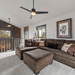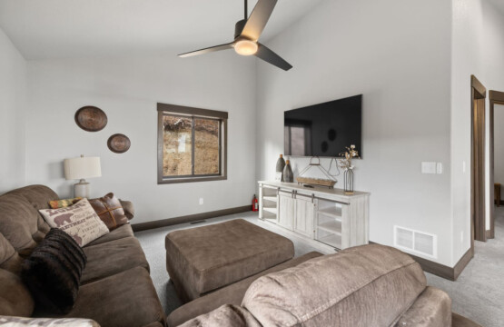 The main level features two well-appointed bedrooms, each with a comfortable queen bed, and a full bathroom for convenience. Upstairs, you’ll find an additional living area—perfect for lounging, watching TV, or playing games—along with two more bedrooms and a second bathroom, providing plenty of space for everyone to spread out and unwind.