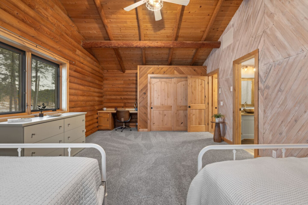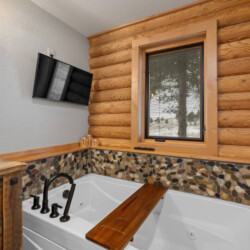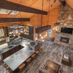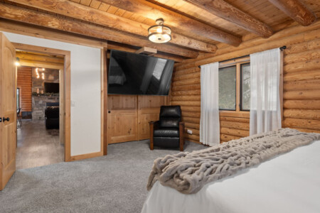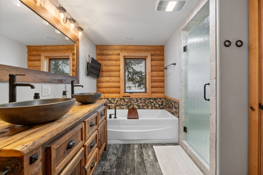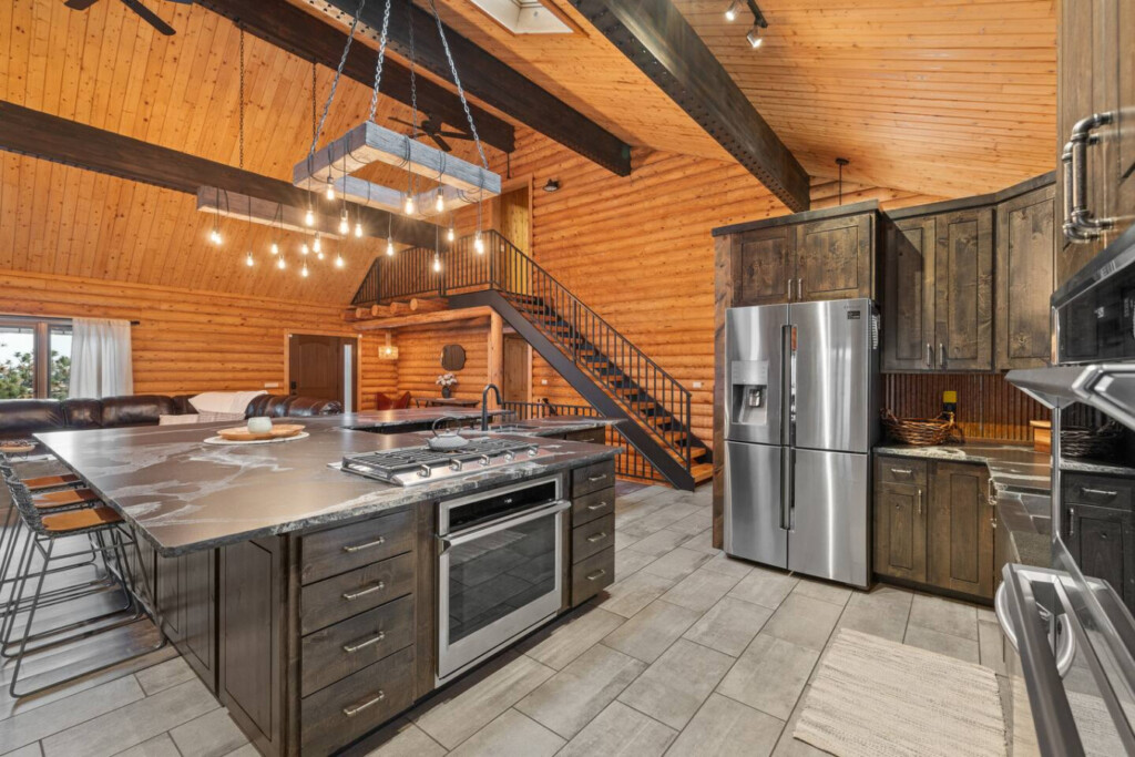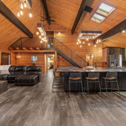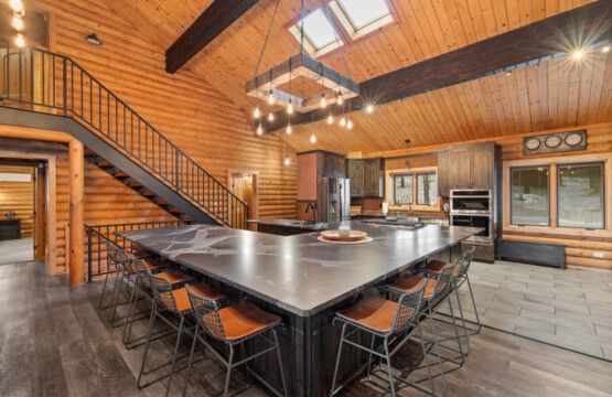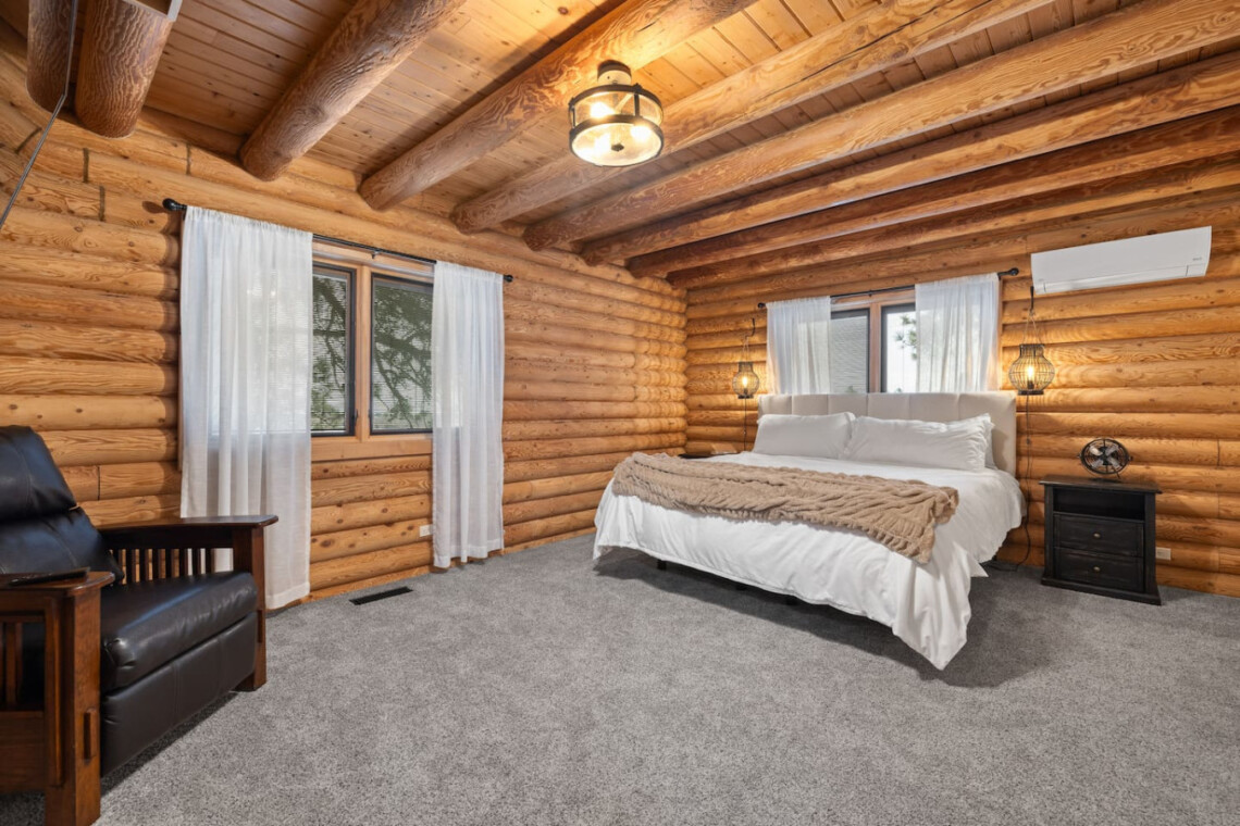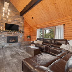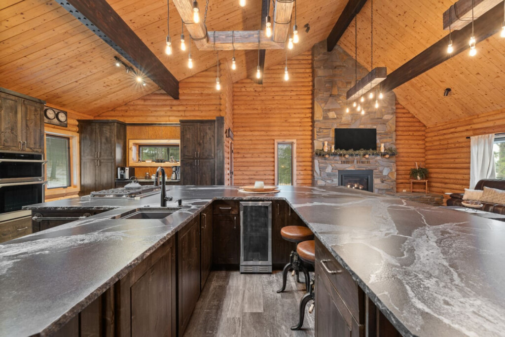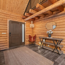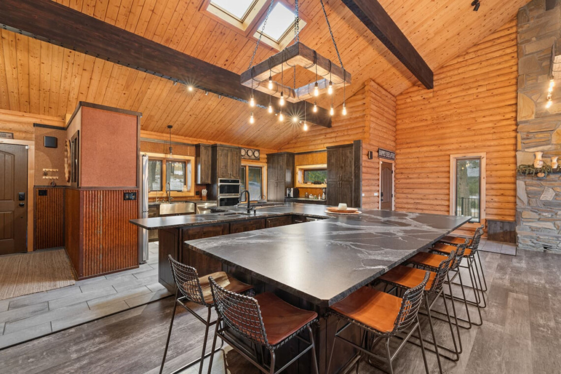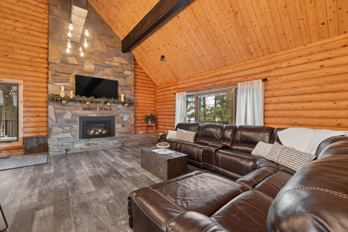 First one is Schroeder’s Grand Log Cabin Lodge — a spacious retreat featuring 5 bedrooms and 6 bathrooms.