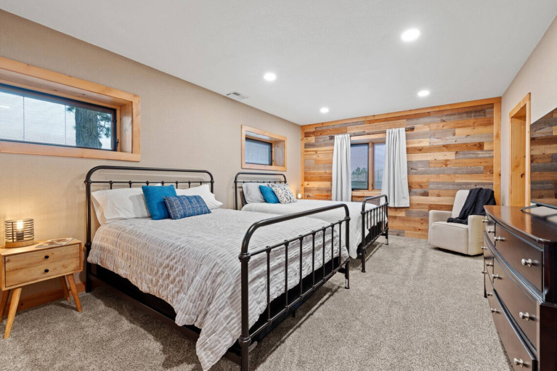 – house has 5 bedrooms with 2 king bedrooms, 1 queen bedroom, and 2 bedrooms with 2 queen beds each