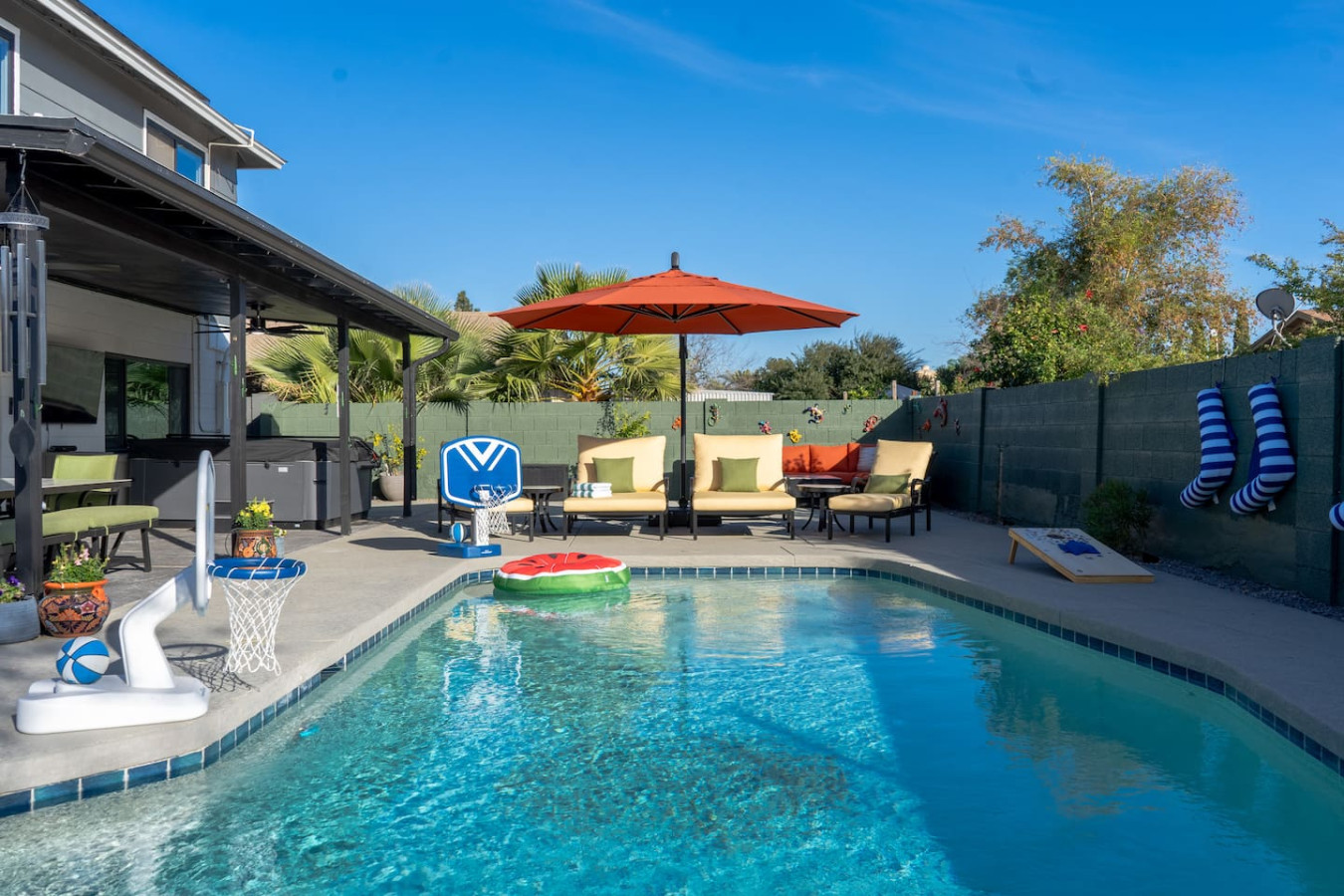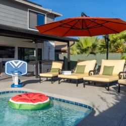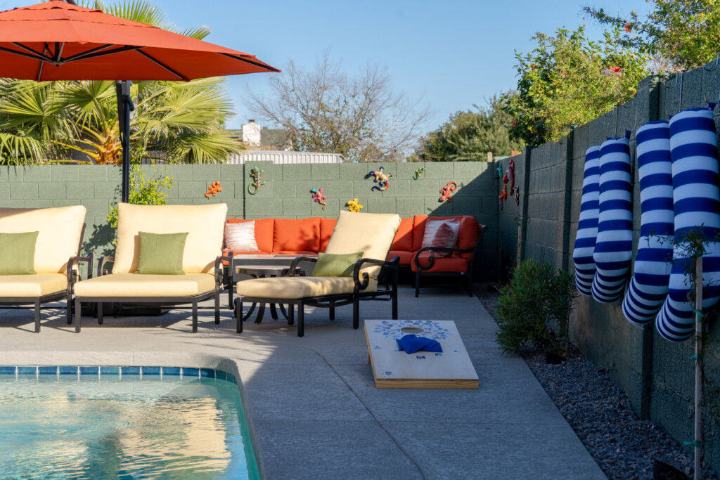 – Play outdoor games including pool basketball, floaties, cornhole