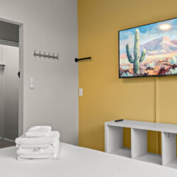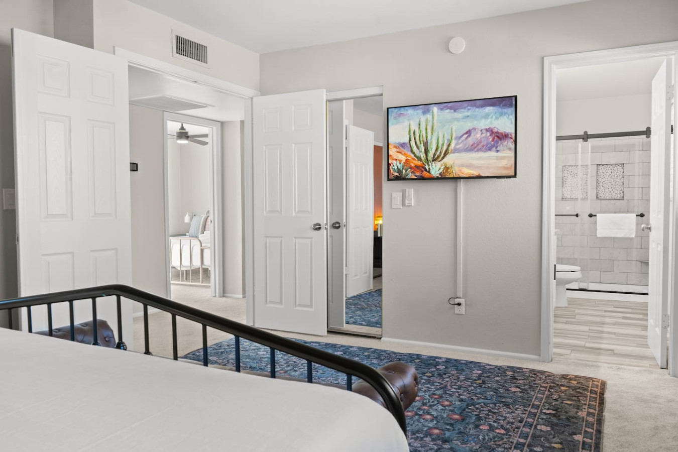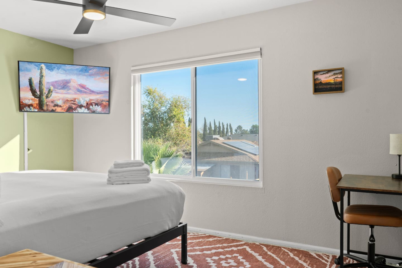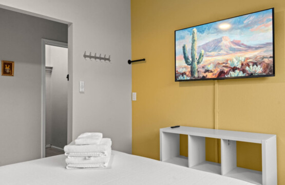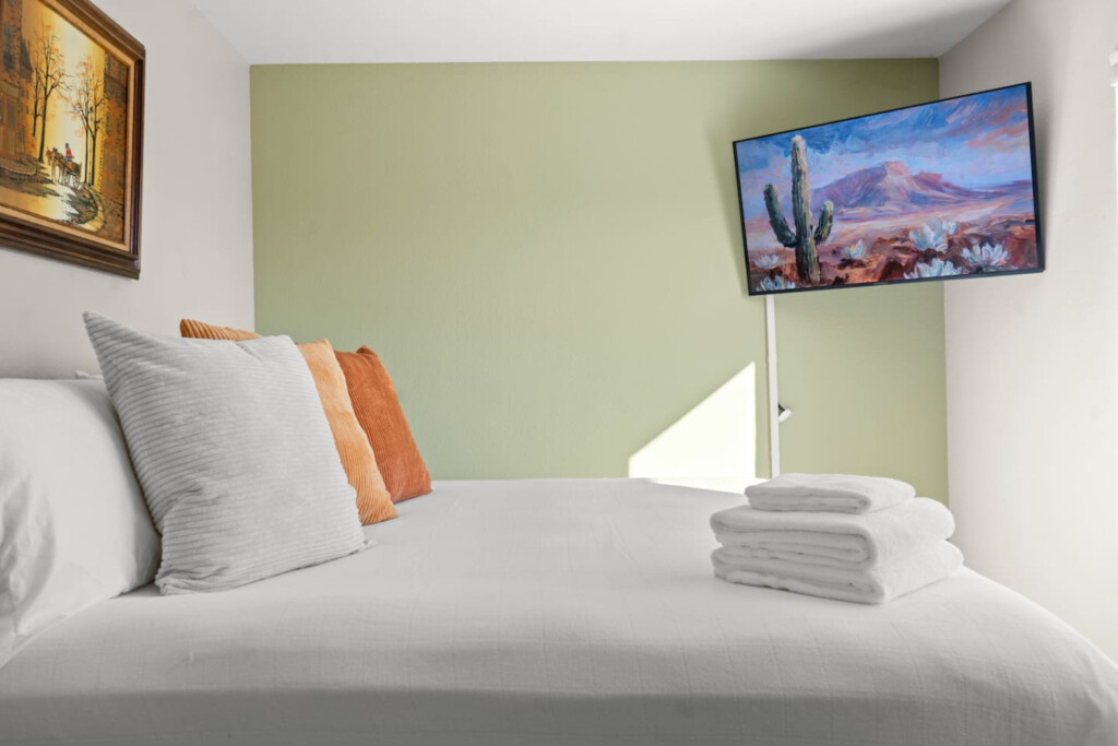 – Living Room: Spacious with a big TV for comfort